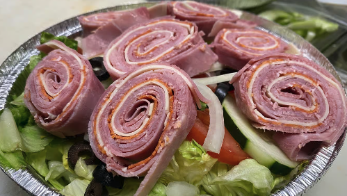 Treat yourself to an Antipasto Salad brimming with delicious Salami, Ham, Pepperoni, and Provolone Cheese. Topped with Lettuce, tomatoes, onions, black olives, and cucumbers. This low-carb and high-protein option is a tasty and nutritious choice.
