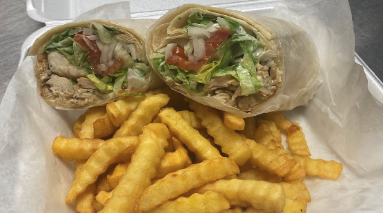 Satisfying tuna wrap loaded with a tuna/mayonnaise mixture, accompanied by lettuce, tomatoes, onions, and American cheese. A healthy choice for a quick and nutritious meal on the go.