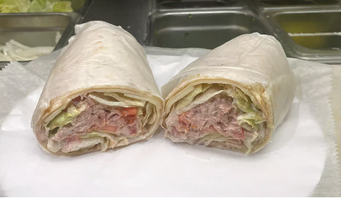 Satisfying tuna wrap loaded with a tuna/mayonnaise mixture, accompanied by lettuce, tomatoes, onions, and American cheese. A healthy choice for a quick and nutritious meal on the go.